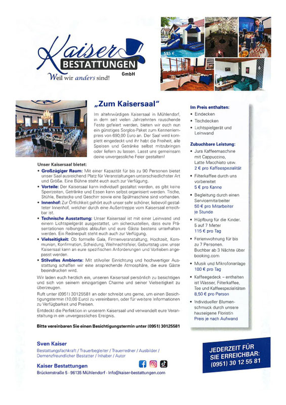 · Vorteile: Der Kaisersaal kann individuell gestaltet werden, es gibt keine Sperrzeiten, Getränke und Essen kann selbst organisiert werden. Tische, Stühle, Bestecke und Geschirr sowie eine Spülmaschine sind vorhanden.